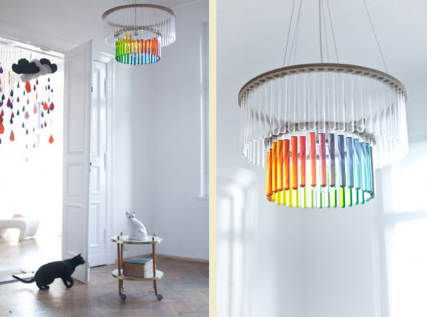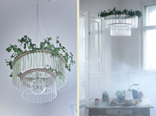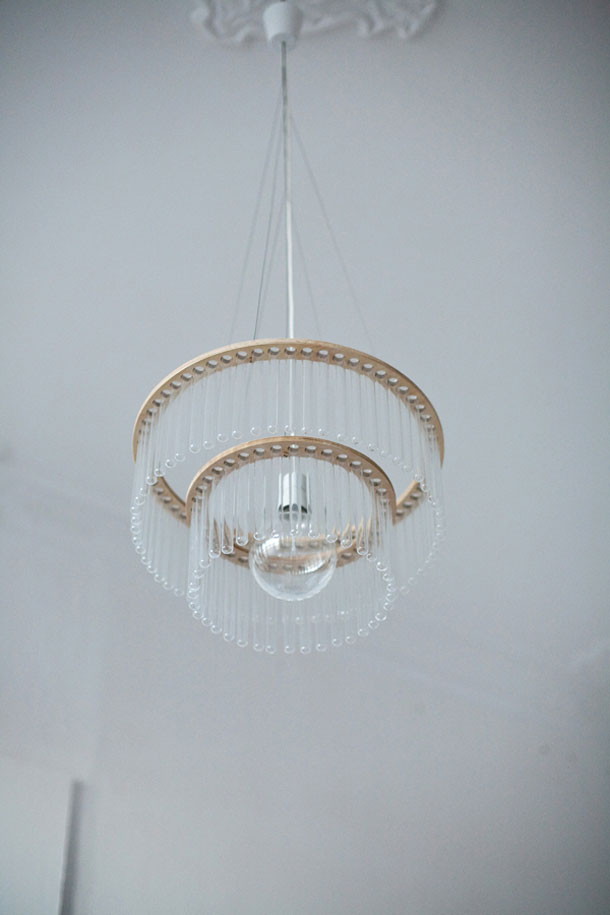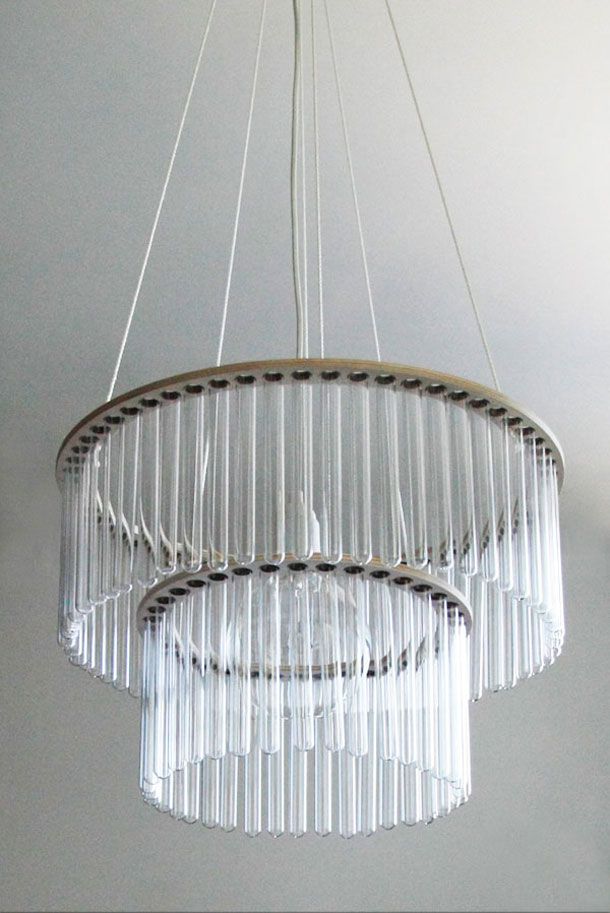 Da se ponekad najefektnija dizajnerska rješenja nalaze u jeftinim i dostupnim materijalima u kojima je potrebno samo probuditi kreativni potencijal, pokazali smo vam nekoliko puta. Ovaj puta to će biti suptilna verzija kristalnog lustera, ali mnogo jeftinija, uradi-sam inačica poljskog dizajnera Panija Jureka. Luster nazvan Maria S.C. samo izgleda kao kristalni luster, no u stvarnosti je riječ o kompoziciji sastavljenoj od žarulje, dva drvena perforirana koluta i mnoštva laboratorijskih epruveti!