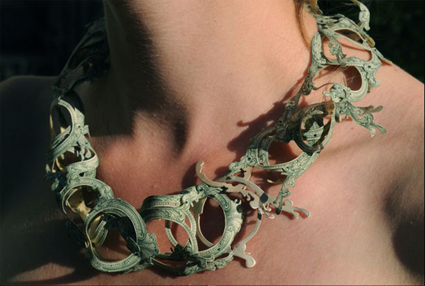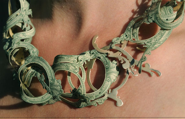 Koristeći novčanice dolara, srebro, lateks i flaks, stvara dojmljive ogrlice i broševe koje koštaju u vrijednosti potrošenog novca kao materijala- od 14.50 $ do malo skupljih za 30.00$. U konačnici demonstrira kako su svi luksuzni objekti za kojim žudimo zaista fetiširani sirovi materijal. Izuzetno inteligentno promišljanje, no pitamo se hoće li Narodna banka također blagonaklono gledati na kritiku ekonomske vrijednosti novca kroz njegovo uništavanje?