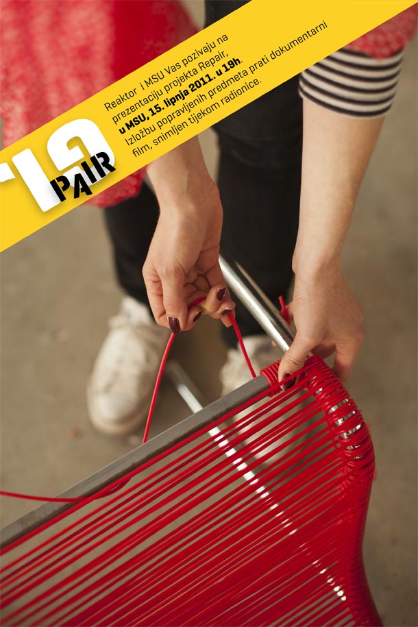 Podsjetimo, na poziv ReAktora u svibnju, građani Zagreba donijeli su svoje uništene predmete na popravak mladim dizajnerima. Njih čak 25 je u radionici kroz interakciju s vlasnicima predmeta, transformiralo stare funkcionalnost predmeta i čak im pridodalo nove, pri čemu su neki i promijenili oblik, u nekim slučajevima do neprepoznatljivosti. Lampa je tako postala vješalica, stari drveni radio nova lampa, a vješalica zastor! Autor i voditelj cijelog projekta je Ivana Fabrio, docentica na Studiju dizajna u Zagrebu, koja je zajedno s Domagojem Kunićem, fotografom i snimateljem, pripremila i kratki dokumentarni film Re:Pair, čije će se premijerno prikazivanje održati također u sklopu jednovečernje izložbe u srijedu. Film razotkriva osebujne, a ponekad i dirljive priče koje opisuju formiranje emocionalnih veza između predmeta i njihovih vlasnika.