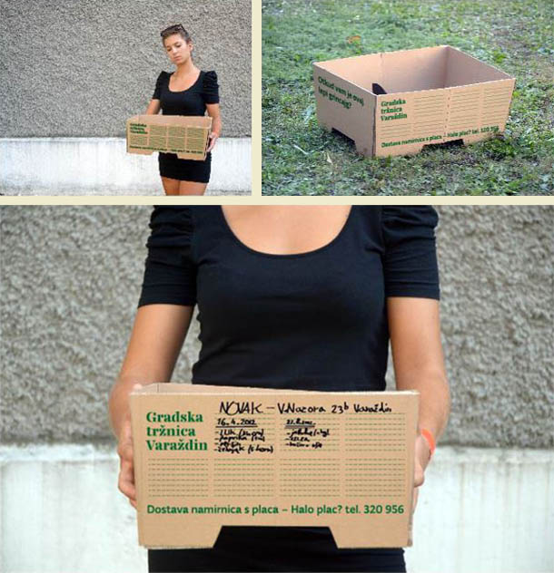 Varaždinska tržnica jedna je od prvih tržnica u Hrvatskoj koja nudi uslugu dostave proizvoda na kućnu adresu, što je studentima poslužilo kao inspiracija za transportne dostavne kutije na kojima se može ispisati adresa naručioca ili cijene ostalih namirnica, na taj način potencirajući komunikaciju s tržnice na daljnje korisnike njezinih proizvoda. Istovremeno ti isti škarnicli i kutije kumicama i prodavačima na placu mogu poslužiti kao sirovina za ispisivanje informacija, cijena proizvoda, količine i sl. Sve proizvodi, kako bi se naglasila autohtonost koncepta i ideje, prati tekstualna elaboracija kroz lokalni dijalekt.