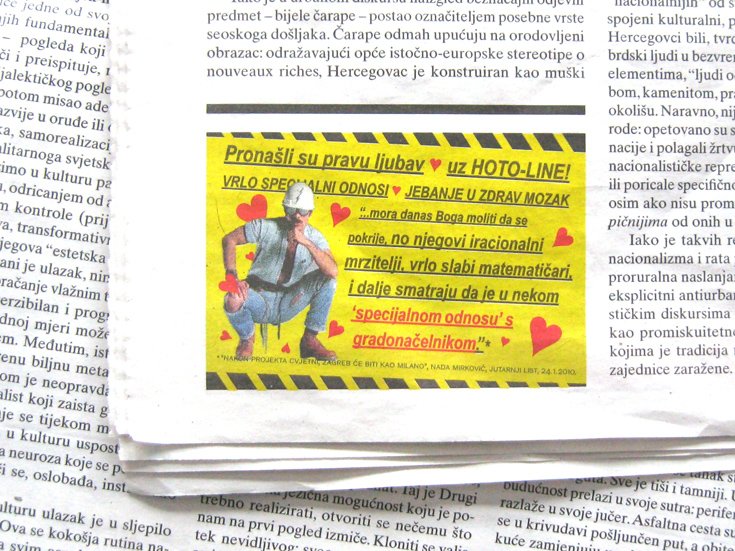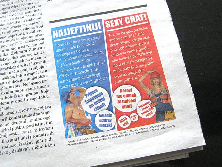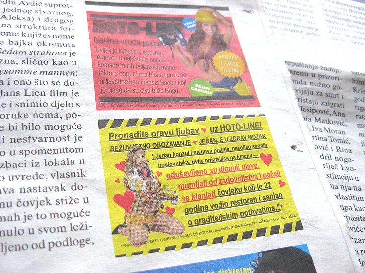 Dva teksta objavljena u Jutarnjem listu povodom događanja oko projekta Cvjetni trg Hoto grupe inspirirala su antikampanja Hoto-line, objavljenu u novome broju časopisa Zarez. Kampanja u formi ”vrućih oglasa” koristi citate iz članka “Graditelji na meti razgraditelja grada” i “Nakon projekta Cvjetni, Zagreb će biti kao Milano“, objavljenih krajem siječnja u Jutarnjem listu, a kojima se hvali investitor Tomo Horvatinčić.