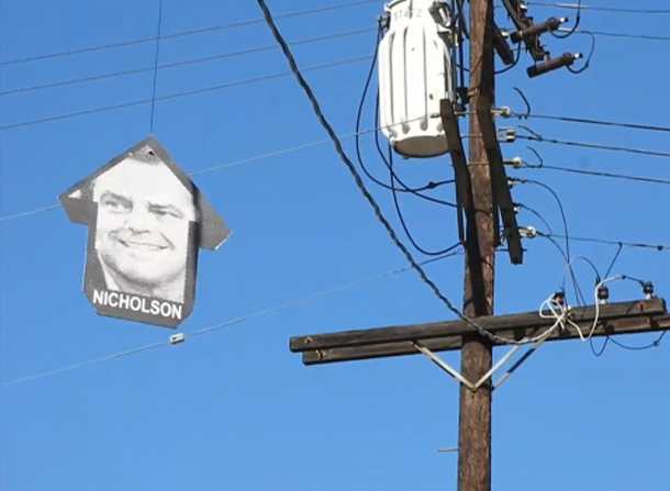ABOVE je pseudonim pod kojim se krije mladi američki street art umjetnik. Njegov točan identitet, kao i primjerice Banksyjev, javnosti je nepoznat, no pretpostavlja se da ima oko 30 godina, a njegova dugogodišnja grafiterska karijera proteže se od rodne Kalifornije, preko Pariza, pa do internacionalnog uspjeha, stoga je danas gotovo cijeli svijet njegovo polje djelovanja. Najprepoznatljiviji je po svojim višeslojnim šarenim socijalno politički angažiranim uličnim radovima, zatim velikim zidnim muralima sa igrama riječi te instalacijama drvenih strelica koje se rotiraju u zraku. Upravo “zračne strelice” su jedna od njegovih posljednjih gradskih prostornih instalacija, a grad u kojem je postavljen niz visećih rotirajućih elemenata je Los Angleles . Radi se o drvenim znakovima na kojima je redom po 50 najpoznatijih muških i ženskih filmskih zvijezda kako današnjice tako i svih vremena. “Movie star arrow mobiles”, drvene panele na kojima su prikazani Marylin Monroe, Brad Pitt ili Penelope Cruz, ABOVE je objesio po srcu grada, dajući LA-u ogromnu dozu upravo onog čime je u potpunosti opsjednut, filmske junake i zvijezde, glavni razlog zbog kojih grad i jest toliko poznat.