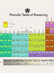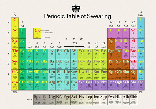 Ilustratori Jon i Mick iz kreativnog kolektiva Modern Toss zaslužni su za „Periodic Table of Swearing“, periodični sustav psovanja, pomno razrađenu tabelu gdje helij, silicij i mangan zamijenjuju kratice živopisnih i lucidnih psovki. Ima tu svega; kreativnih beštimji, raznoraznih prostih riječi, spominjanje roditelja, muških i ženskih organa u različitim scenarijima, uglavnom svih onih „neprikladnih“ kombinacija riječi koje postoje u vokabularima bilo kojeg jezika, a koje većina nas prvo nauči prijatelje koji ne pričaju vaš jezik.