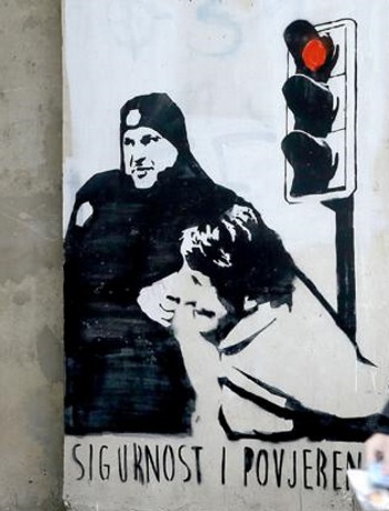 Nepoznatog osječkog grafitera (ili skupinu njih) događaj se toliko dojmio da se pobrinuo podsjetiti sugrađane na nj. Prikaz je autentičan, isprve je moguće prepoznati tko su likovi na grafitu, a tu je i policijski slogan “Sigurnost i povjerenje”.